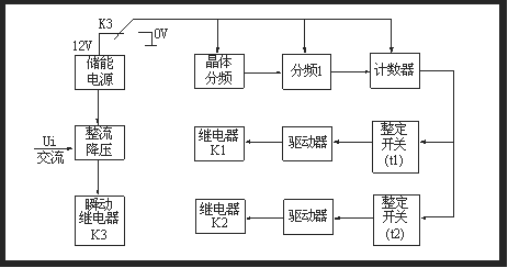 繼電器有晶體振蕩器、分頻器、整定開關、驅動電路和電源回路等組成。當繼電器施加額定電壓時,繼電器內部瞬動繼電器和兩個延時繼電器瞬時動作,觸點切換,并使電源回路與計時回路處于失電狀態(tài),以提高繼電器抗干擾性能。當輸入電壓大大降低或完全消失時,瞬動繼電器瞬時返回(兩個延時執(zhí)行繼電器仍處于動作狀態(tài)),觸點也瞬時返回,使儲能電源接通計時回路,晶體振蕩產(chǎn)生時鐘脈沖,經(jīng)分頻后得到10ms計時脈沖,計數(shù)器對計時脈沖計數(shù),當所計脈沖數(shù)與整定開關值符合時,驅動執(zhí)行繼電器返回,完成斷電后延時返回的功能。原理圖如下圖所示