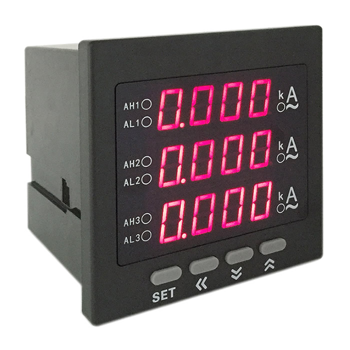 對用電線路中的三相電流同時進行實時測量,并以數字直讀方式顯示。用一只三相電流表即可完成三只普通電流表才能完成的A相電流、B相電流、C相電流的測量任務。在提供實時測量與指示功能的同時,儀表還可通過安裝不同的功能模塊使其支持模擬量變送、上下線報警、RS485通訊功能。支持三路變送同時輸出、三路報警觸點(三個繼電器)、三路報警一個繼電器輸出、RS485通訊輸出、三路報警一個繼電器輸出加上RS485通訊輸出工六種輸出方式(注:48*48和80*80方形儀表不支持輸出功能)。通過儀表面板上的可編程鍵盤可對儀表的互感器倍率、上下線報警值、報警回差、儀表通訊地址、通訊波特率、變送輸出規格、對應的變送輸出范圍等參數進行編程設置。